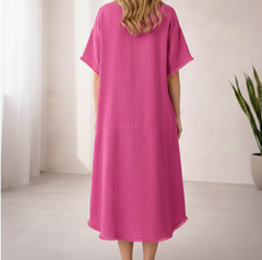 The Hazel Dress in Wild Orchid Pink is crafted from 100% premium linen, offering breathable comfort and effortless elegance. Designed with a relaxed fit and flowing silhouette, this long dress drapes beautifully for all-day wear. The soft texture and airy feel make it perfect for warm days, casual outings, or relaxed evenings, blending timeless style with everyday comfort.